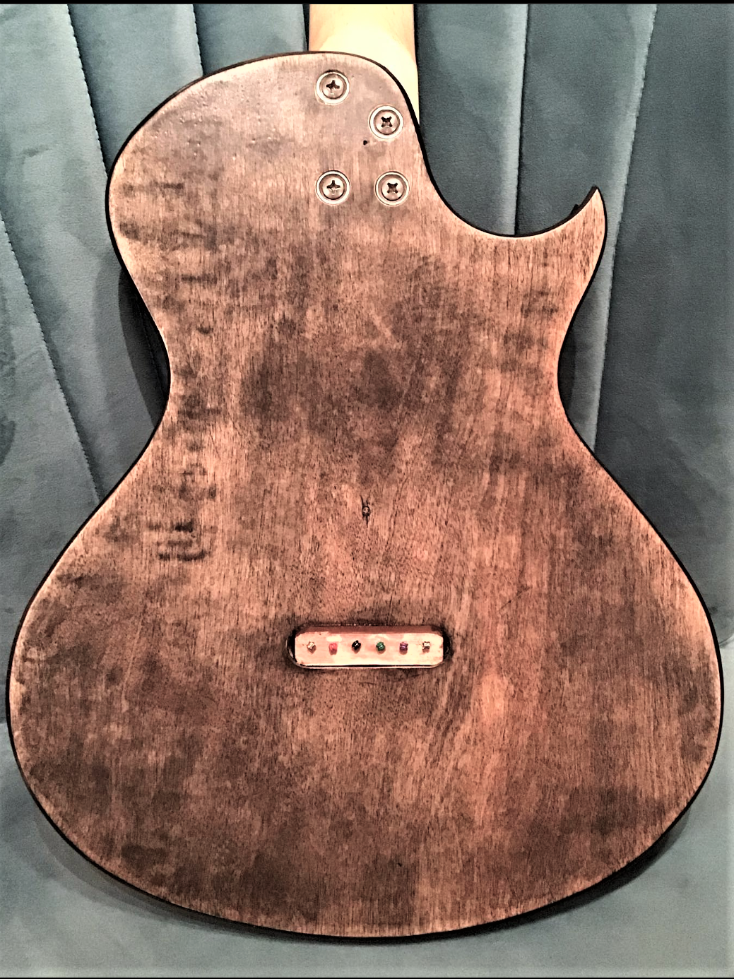 “Copper Blue Jeans,” is what I call this one. This is another parts series guitar where I designed a unique shape out of affordable materials to create a funky one-of-a-kind guitar. This is the second “copper-side” guitar I’ve made, after the first one generated quick interest. Two humbuckers give it the beefy tone of a Les Paul, with the ability to cut through the mud when the bridge pickup is selected. 25.5” scale, body-through construction, bone nut. Volume, Tone, 3-way Selector.
